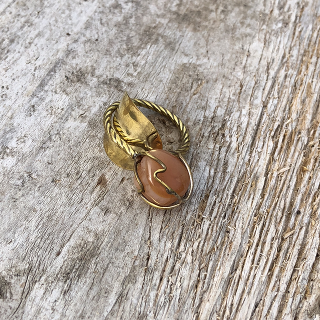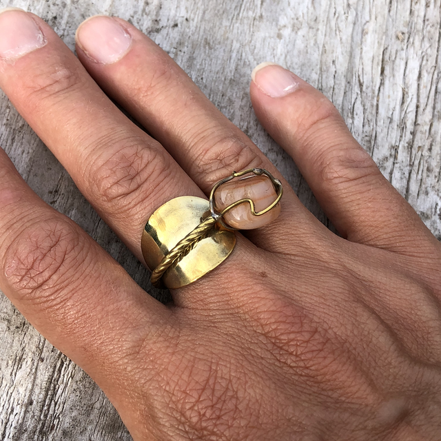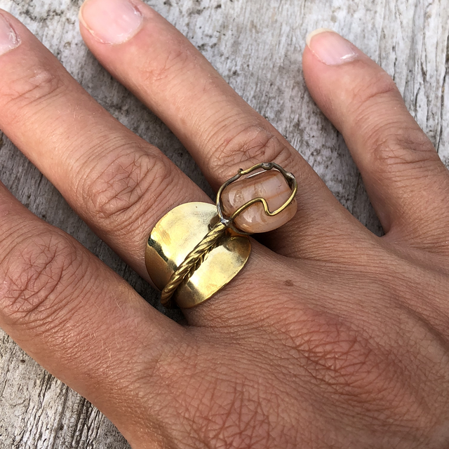 Bague faite à partir d’une cuillère à moka en laiton doré et pierre semi-précieuse.