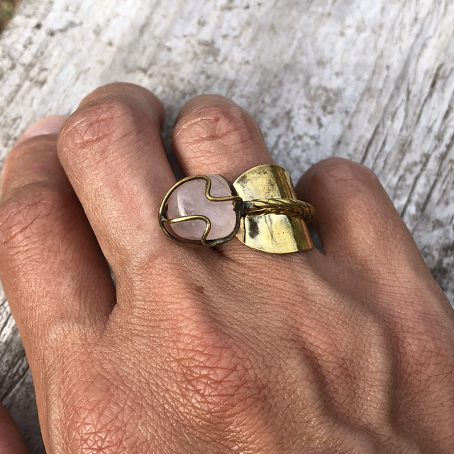 Bague faite à partir d’une cuillère à moka en laiton doré et pierre semi-précieuse.