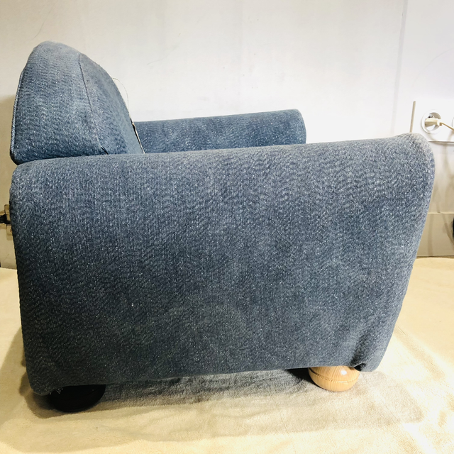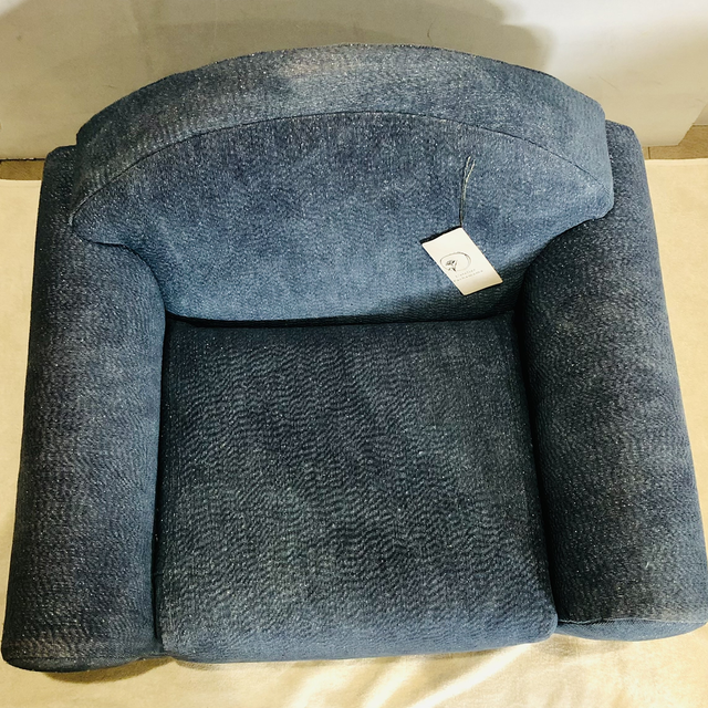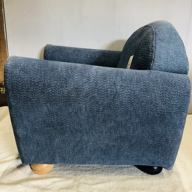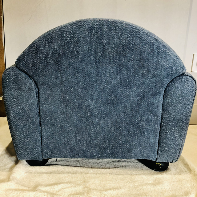 Fauteuil club enfant chiné puis restauré par mes soins avec un tissu d’ameublement coloris « jeans » avec une pointe de lurex argenté qui apporte un léger effet pailleté, peu révélé en photo.