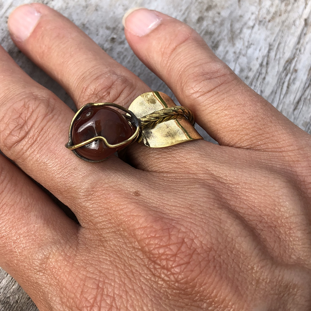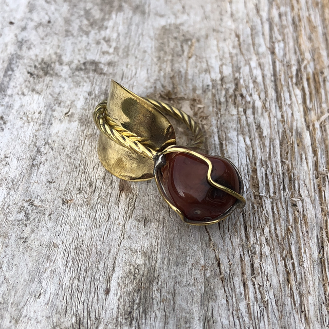 Bague faite à partir d’une cuillère à moka en laiton doré et pierre semi-précieuse.